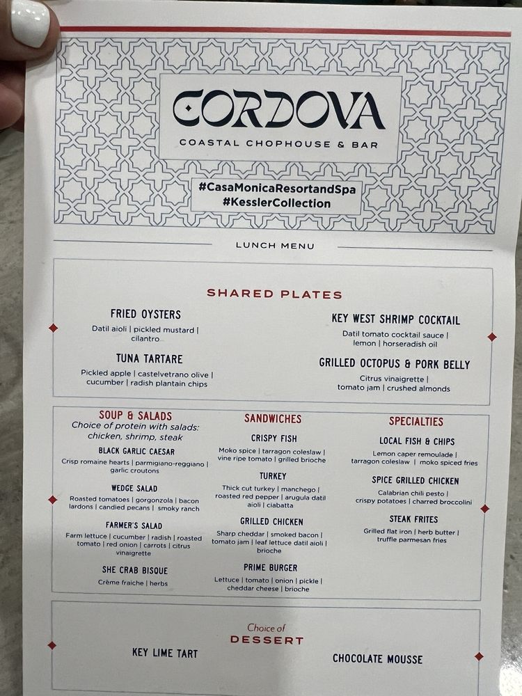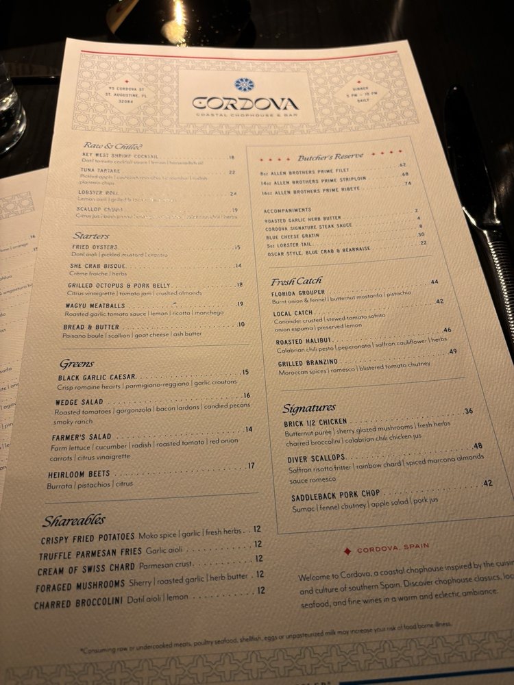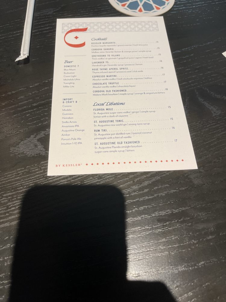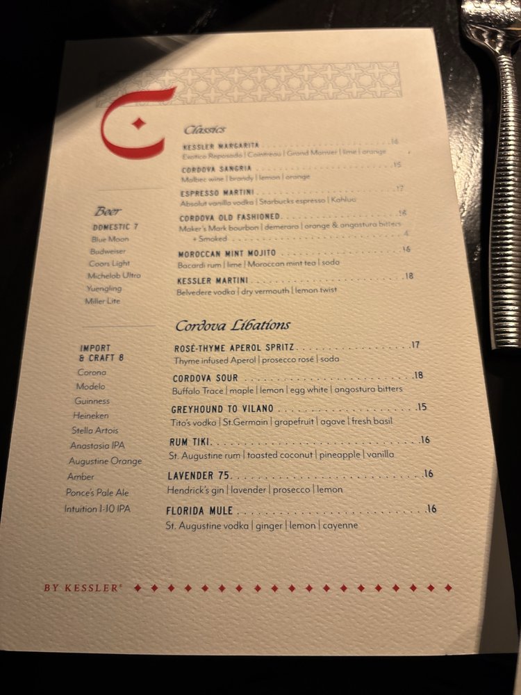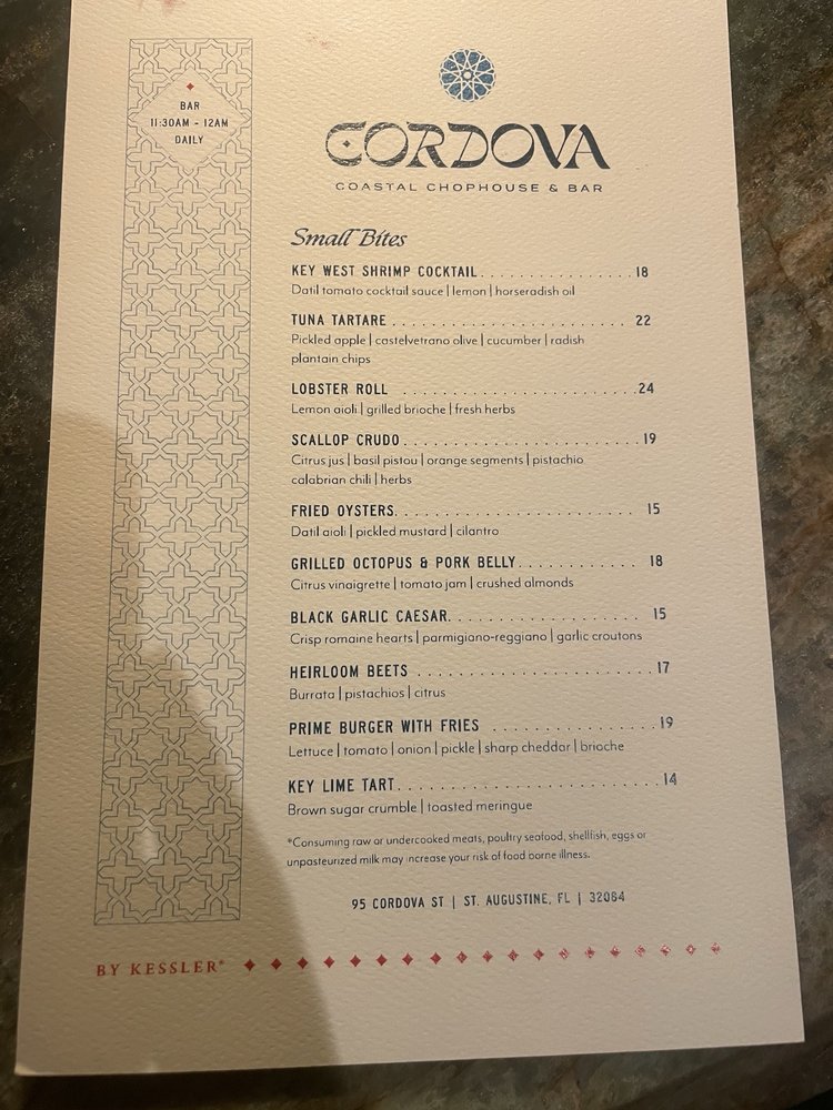 Cordova, located at 95 Cordova St in St. Augustine, FL, offers a luxurious dining experience with a wide range of amenities. From upscale dining to outdoor seating, this restaurant caters to all preferences. They provide an extensive menu with options for every diner, including delicious raw and chilled seafood like Key West Shrimp Cocktail and Tuna Tartare. Their starters, such as Fried Oysters and She Crab Bisque, set the tone for a satisfying meal. The restaurant's ambiance and attentive service enhance the overall experience, as noted by patrons who praised the food and professionalism of the staff. Cordova is a must-visit for those seeking a refined dining experience with exceptional dishes that leave a lasting impression.